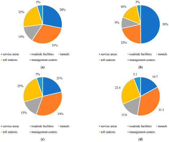 where represents the total energy consumption (kWh); , , , , and denote the energy consumed by service areas, tunnels, toll stations, operation management centers, and roadside facilities, respectively.