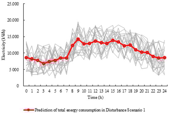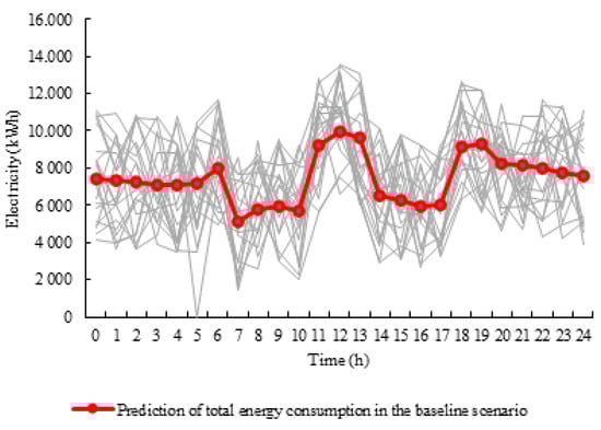 Figure 7 illustrates that the total energy consumption curve in the baseline scenario exhibits a positive correlation with vehicle traffic. The trend of traffic flow changes mirrors that of the total energy consumption curve. Due to low traffic volume and facility usage in the early morning, there is a trough in energy consumption between 6:00 and 8:00. From 10:00 to 14:00, during the peak period of daily travel, the number of vehicles entering service areas gradually increases, leading to frequent activities and a local peak in total energy consumption, which rises significantly to around 9940 kWh. Between 14:00 and 17:00, with fewer vehicles entering the service areas, energy consumption decreases again. From 18:00 to the next morning at 6:00, lighting systems across various service scenarios are turned on, causing energy consumption to rise and stabilize between 6000 kWh and 8000 kWh.