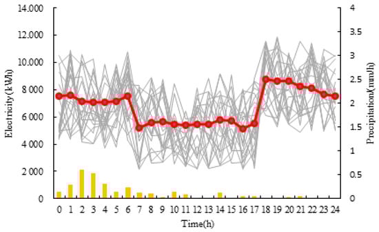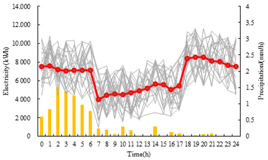 Here, denotes the total number of samples, and represents the energy load and highway information for the -th day; is the energy consumption during the -th hour of the -th day; is the average traffic volume for the -th day; and is the average precipitation for the -th day.