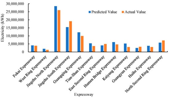 To further assess the accuracy of the developed model, this study utilized energy consumption data from 12 cities [32,33] to conduct a comprehensive validation analysis of the highway energy consumption model. In the validation process, the actual parameter values collected were first input into the model to predict the total energy consumption for each highway. These predicted values were then compared with the observed values to evaluate the model’s predictive accuracy. The results of this validation are presented in Figure 11 and Table 5, which clearly illustrate the comparison between predicted and actual values.