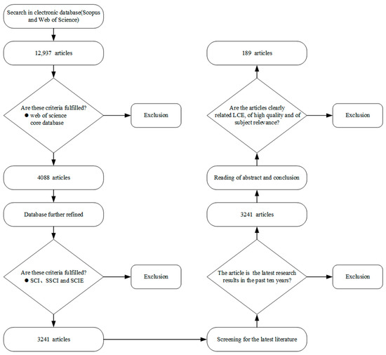 Scientometrics is a discipline that applies quantitative methods to studying the laws of scientific and technological development and uses mathematical and statistical methods to quantitatively analyze the results, processes, and related activities of scientific research [16,17]. Scientometrics is an extensive and evolving field that not only helps people understand the dynamics of scientific activities but also provides a scientific basis for the formulation and management of science and technology policies [18,19]. A knowledge graph is a semantic network used to describe the relationship between entities, which graphically expresses knowledge and its relationship [20]. The knowledge graph transforms real-world information into graphics, where nodes represent entities and edges represent relationships between entities [21]. The structured representation method enables the knowledge graph to systematically display the knowledge system and reveal the internal relationships between the knowledge [22]. The analysis of research hotspots and emerging trends of LCE through scientometrics knowledge graph research methods has the following advantages, the first of which is objective and accurate data analysis. Comprehensive and accurate data can be collected based on a large amount of academic literature, patent data, industry reports, and other information sources; LCE-related research can be collected and collated. The second advantage is the precise identification of the hot areas. Using the analysis method of knowledge graphs, such as keyword co-occurrence analysis and literature cluster analysis, we can quickly identify research hotspots and emerging trends that have received widespread attention in LCE. Finally, information can be systematically evaluated. Its focus is not on information from the literature but on helping scholars to explore the essential relationship between literature information and assess the quality of literature information. This is consistent with our research objectives.