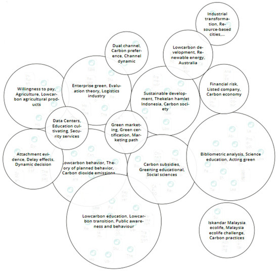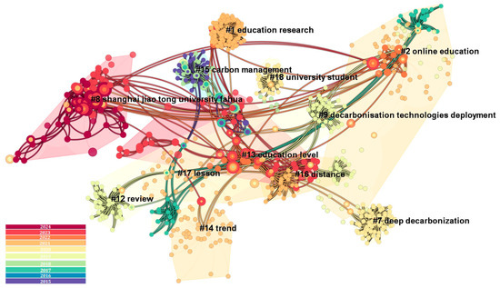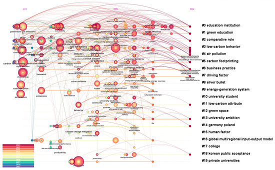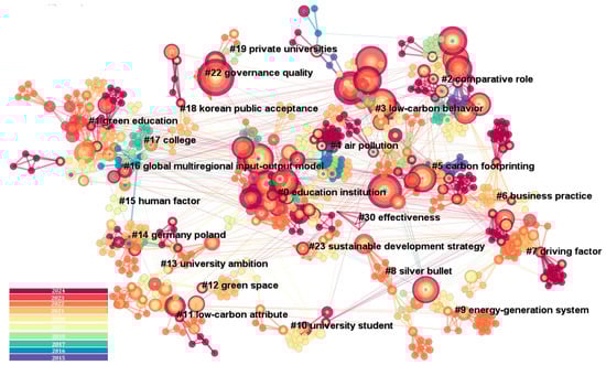 Through the observation of Figure 8, it can be seen that from the perspective of forming clustering themes, low carbon and education are still the research themes in the field of low-carbon education. Simultaneously, the role of education in low carbon has been paid more and more attention by scholars. Moreover, “#0 education institution”, “#1 green education”, and “#2 comparative role” are the three largest clusters, all of which belong to scholars’ thinking on low carbon from the perspective of education. From the perspective of the main research directions in the field of LCE, “#0 education institution”, “#1 green education”, “#2 comparative role”, “#10 university student”, “#13 university ambition”, “#17 college”, “#19 private universities” are the contents of university LEC; “#4 air pollution”, “#6 business practice”, “#7 driving factor”, “#8 silver ballet”, “#9 energy-generation system”, “#12 green space”, “#16 global multiregional input-output model”, “#30 effectiveness” belong to the content of low-carbon social education; “#3 low-carbon behavior”, “#5 carbon footprinting”, “#14 low-carbon attribute”, “#15 human factor”, “#18 Korean public acceptance”, “#22 governance quality”, “#23 sustainable development strategy” can be regarded as the content of behavior LCE. We note that “#14 Germany Poland” is a separate cluster, outside of the three main research directions. By further analyzing the keywords within the cluster, we find that the main keywords in “#14 Germany Poland” focus on low-carbon research. Because Germany is the first country to put forward the concept of “low-carbon” and actively advocate for a low-carbon economy; its mature research in the field of low-carbon has caused scholars to gradually extend their view to the reflection of education and has produced many achievements in the field of LCE. Compared to the clusters covered by the main research directions, university LCE is still the main research direction, which has advantages in terms of the number and importance of its clusters.