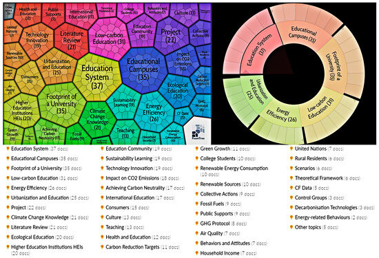 To further demonstrate the research hotspots and emerging trends in the collected literature, we used Carrot2 4.7.0 (https://search.carrot2.org/#/search/web, accessed on 26 December 2024) to generate tree and pie charts of LCE, and the results are shown in Figure 4. It can be seen from the tree diagram that “Education System” is the main research topic of LCE, which is consistent with our previous conclusions. “Educational Campuses”, “Footprint of a University” and “Low-carbon Education” are the key directions of LCE, covering three aspects: research sites, research contents and research topics. This shows that university LCE is still the main direction of LCE, and the academic circles have tried to explore the field of LCE from multiple perspectives and in various directions to promote the development of this research. From the pie chart, “Energy Efficiency” and “Urbanization and Education” are also research focuses of LCE. LCE emphasizes that through education and training, people’s awareness and understanding of low-carbon life, low-carbon economy, and low-carbon technology can be improved to promote the transformation of society to low-carbon. At the same time, LCE is also an important way of spreading low-carbon knowledge and cultivating low-carbon awareness. This shows that research in the field of LCE pays more attention to practicality and the role of education in energy efficiency. At the same time, LCE also attaches great importance to social LCE and behavioral LCE.