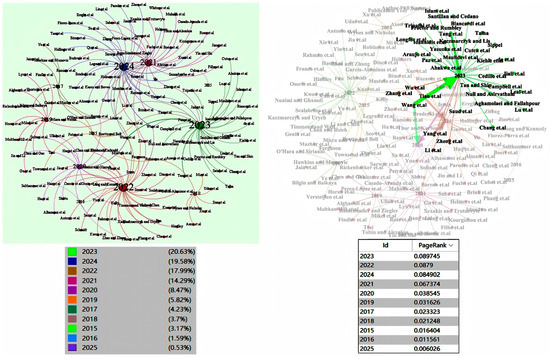 Gephi provides a variety of layout algorithms to show the network structure, which can adjust its visualization effect according to the different properties of the nodes and edges [24]. We imported the dataset into Gephi and used the “Fruchterman Reingold” layout for the reference co-citation network, as shown in Figure 5. This algorithm was selected for clarity of visualization. The spherical section at the lower left includes 173 nodes and 183 connections. The node represents a different reference. The size of the node represents the number of references, the color represents the time when the reference occurred, and the color of the connection represents the time when the connected reference was first cited. It can be seen that the literature on LCE basically shows an increasing trend year by year. The literature is mainly concentrated in 2022–2024, and the colors are mainly green, blue, and brown. This is consistent with our previous division of the literature. The number of citations in this field has increased in recent years, indicating that LCE research is in a period of explosive growth. We further classified the network according to “PageRank”, as shown in the spherical diagram on the right. The nodes in this section still represent different references, but the colors of the nodes indicate the importance of a reference to the entire field. Combined with the table on the right side of the figure, it can be seen that the articles written in 2023 are not only cited many times but also ranked very high in the PageRank. A series of articles published in 2023 had a great impact on LCE research. In terms of research content, the main research hotspots in 2023 are still “College Students” and “Society Education”, which is consistent with our previous research. It can be observed that the study of the subject will remain a trend in LCE in the future.