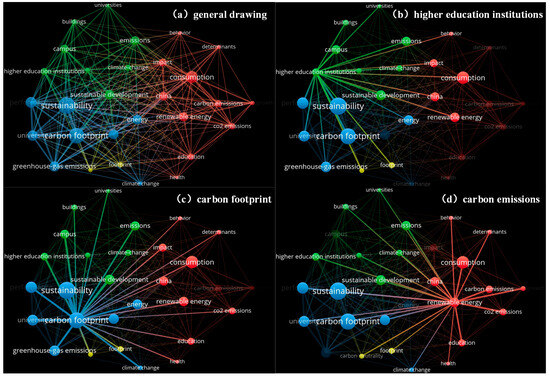 Visual landscape of LCE’s co-occurrence keywords: (a) general drawing; (b) higher education institutions; (c) carbon footprint; and (d) carbon emissions.