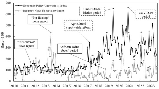 Trends of the Economic Policy Uncertainty Index and Pig Industry News Uncertainty Index. Source: Policy Uncertainty official website (https://www.policyuncertainty.com/ (accessed on 1 September 2024)), People’s Daily statistics (http://paper.people.com.cn/rmrb/pc/layout/202502/24/node_01.html (accessed on 1 September 2024)).
