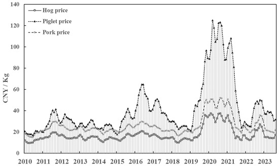 Price fluctuation trend of live pig industry chain. Source: National Bureau of Statistics of China (https://data.stats.gov.cn/index.htm (accessed on 1 September 2024)).