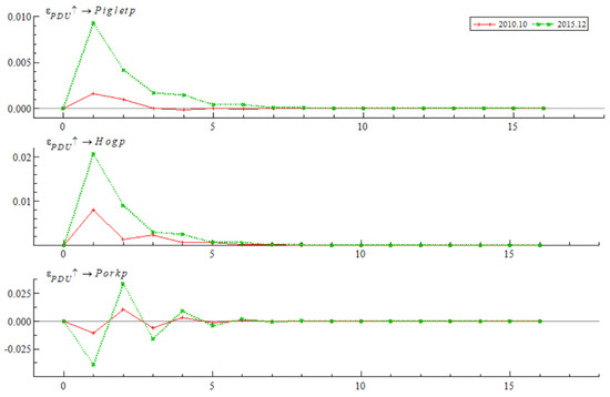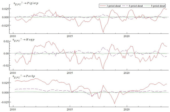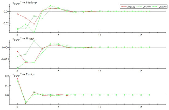 The impulse response results of the live pig industry chain prices to Economic Policy Uncertainty (EPU) at specific historical points are illustrated in Figure 6. The selected historical points include February 2017, July 2019, and March 2021, corresponding to significant events such as China’s agricultural supply-side reform, the US–China trade war, and the COVID-19 pandemic, respectively. The impact of EPU on the prices of the live pig industry chain at these specific points exhibits several distinctive features: