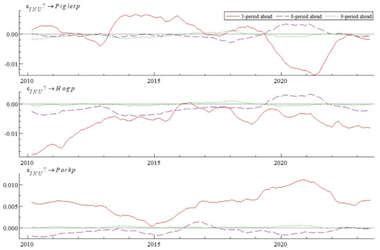 - INU and Supply-Side Prices: Across the entire interval, a standard deviation’s positive INU shock causes alternating positive and negative impacts on piglet prices, with the intensity fluctuating between [−0.01, 0.01]. In 2019, the impact shifted from positive to negative. INU consistently exerts a negative influence on hog prices, with the intensity ranging from [−0.016, 0], gradually weakening from 2010 to 2015. The primary reason for this pattern in piglet prices is their susceptibility to INU shocks, accentuated by changes in live pig stocks. The outbreak of negative news leads breeders to reduce their production capacities, decreasing the demand for piglets. As government measures such as the “Lean Meat Essence Special Rectification Plan” and the “Live Pig Production Capacity Control Implementation Plan” come into effect, increasing regulatory intensity gradually mitigates the negative impact of the news. This results in an increase in breeders’ enthusiasm to expand their pens, boosting the demand for piglets.