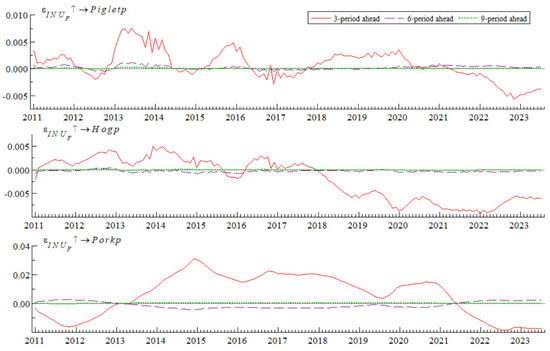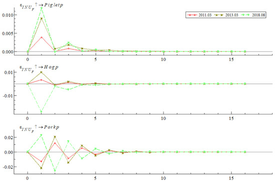 The impulse response results of the live pig industry chain prices to Industry News Uncertainty (INU) at specific historical points are shown in Figure 8. The selected points include March 2011, January 2013, and August 2018, corresponding to major news events such as the “Clenbuterol incident,” “pig drifting incident,” and the outbreak of “African swine fever,” respectively. The impact of INU on the live pig industry chain prices at these points exhibits several notable characteristics: