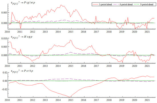 - EPU and Demand-Side Prices: A standard deviation’s positive EPU shock on the demand side also alternates between positive and negative impacts, with the overall trend shifting from positive to negative to positive again, and the intensity varying within [−0.025, 0.025]. These fluctuations display periodicity and stability, with positive responses from 2010 to 2017 and after 2020, and negative responses from 2017 to 2020. The predominance of positive impacts suggests that the market’s demand for pork remains relatively stable, and minimally affected by economic policy changes. The main reasons are economic fluctuations that increase production costs and reduce capacity, leading to excessively high pork prices in the market. However, Chinese residents’ dietary preferences strongly favor pork, and they are unlikely to switch to alternatives simply due to price changes.
