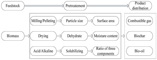 - Impact of pretreatment on biomass: ① The pretreatment of the biomass can change its surface area, reduce moisture content, and adjust the ratio of the three components (cellulose, hemicellulose, and lignin). ② This helps to control the product distribution of pyrolytic poly-generation.