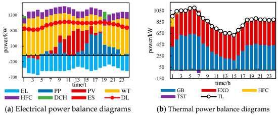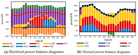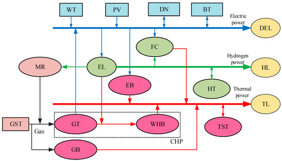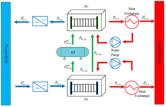 The hydrogen energy system studied in this paper is shown in Figure 2, and the system consists of the fuel cell (FC), heat exchanger (HE), electrolyzer (EL), hydrogen storage tank (HST), water pump (WP), and heat and power grids. Of this, the heat produced by electrolyzer hydrogen and fuel cell electricity can be used for heat loads.