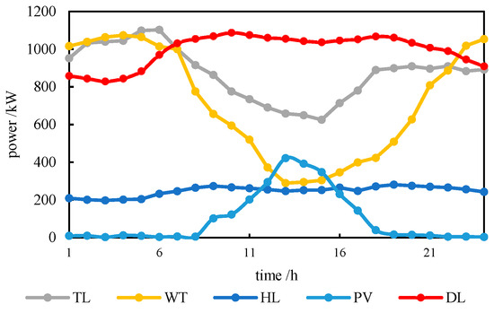 A hydrogen energy storage system (HESS) was developed by utilizing the electric–hydrogen–electric intermutability, and the hydrogen storage system mainly consists of three parts: EL, HST, and FC. In Figure 1, the electric boiler is the thermoelectric coupling unit, and the fuel cell and electrolyzer are the electric–hydrogen–thermal coupling unit. WT and PV are the renewable energy generation in the system, which has a certain degree of volatility and stochasticity.