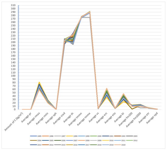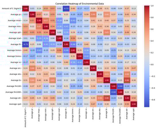 This correlation heatmap visualizes the relationships between environmental variables, contributing to a better understanding of ecological processes. The heat map between the variables is given in Figure 4. When examining the relationships between amount of C (kg/m2) and other environmental factors, strong positive correlations are observed with humidity variables (Average rmax, Average rmin, Average sph). This suggests that carbon accumulation tends to increase in more humid environments. Conversely, a negative correlation is observed with solar radiation (Average srad), indicating that lower solar radiation levels may be associated with higher carbon amounts.