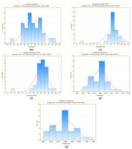 Histogram Scatters; (a) amount of C, (b) pr—Precipitation amount, (c) rmax—Maximum relative humidity, (d) rmin—Minimum relative humidity, (e) sph—Mass fraction, (f) srad—Surface downward shortwave radiation, (g) th—Wind direction, (h) tmmn—Minimum temperature, (i) tmmx—Maximum temperature, (j) vs—Wind velocity, (k) erc—Energy release component, (l) eto—Daily grass reference evapotranspiration, (m) bi—Burning index, (n) fm100—100-h dead fuel moisture, (o) fm1000—1000-h dead fuel moisture, (p) etr—Daily alfalfa reference evapotranspiration, (q) vpd—Mean vapor pressure deficit.
