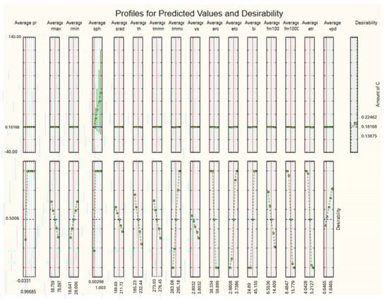 Analysis of Predicted Values and Desirability Profiles is presented in Figure 3. This section provides a detailed examination of the Profiles for Predicted Values and Desirability, analyzing the relationships between independent variables and carbon storage capacity. This analysis serves as a crucial tool for understanding how the model predicts carbon values and how different variables influence these predictions based on predefined suitability criteria. Profiles for Predicted Values and Desirability is a visualization technique commonly used in multivariate regression models to assess the effects of independent variables (climatic factors) on dependent variables (carbon storage capacity). This graph illustrates how changes in different variables impact carbon levels and identifies conditions under which maximum suitability is achieved. Typically, the vertical axis represents carbon storage, while the horizontal axis represents independent variables, such as precipitation, humidity, temperature, and solar radiation. By examining the trends of predicted values for each variable, the model’s behavior and key influencing factors are visualized. A detailed analysis of independent variables reveals their varying impacts on carbon storage. Precipitation (pr) plays a crucial role in soil moisture balance and the biochemical cycling of carbon. The analysis indicates that at low precipitation levels, carbon storage is generally low. As precipitation increases, carbon levels rise, but beyond a certain threshold, this increase stabilizes or slightly declines. This suggests that excessive rainfall may lead to soil erosion and loss of organic matter, potentially limiting carbon sequestration. Therefore, identifying optimal precipitation ranges is essential for developing effective land management strategies.