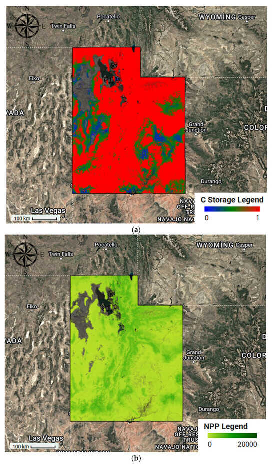The results of this study offer valuable insights into the carbon dynamics of Utah over the past three decades, highlighting the complex interplay of natural and anthropogenic factors influencing carbon storage. Spatial patterns of carbon storage, as indicated by NPP8, show significant variations across the region, with forested areas exhibiting greater carbon storage potential due to higher productivity, while arid and semi-arid regions demonstrate lower carbon storage capacity. This pattern aligns with existing literature, which emphasizes the critical role of vegetation cover and precipitation in determining carbon sequestration across different ecosystems. The lower carbon storage potential in water-limited regions, such as those found in Utah, underscores the importance of water availability in maintaining carbon storage capacity.