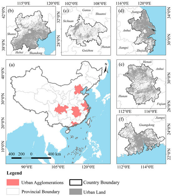 Urban agglomerations are primarily categorized into national-level, regional-level, and local urban agglomerations in China. There are strict requirements and standards for these urban agglomerations in terms of population size and economic output, which have been clarified in detail by Fang [18]. Considering that national-level urban agglomerations account for 9.06% of China’s total land space and 31.39% of its population [18], all five national-level urban agglomerations (Figure 1) were selected for further research in this study. More detailed information on the study area is presented as follows: (1) Beijing–Tianjin–Hebei urban agglomeration (BTH): The BTH (Figure 1b) is located in the North China Plain, which has a temperate continental monsoon climate. It covers approximately 2.18 × 105 km2. (2) Chengdu–Chongqing urban agglomeration (CC): The CC (Figure 1c) is located in southwest China, which has a subtropical monsoon climate. It covers an area of approximately 1.85 × 105 km2. (3) Yangtze River Delta urban agglomeration (YRD): The YRD (Figure 1d) is located in east China, which has a subtropical monsoon humid climate. It covers approximately 2.12 × 105 km2. (4) Middle Reaches of Yangtze River urban agglomeration (MRYR): The MRYR (Figure 1e) is located in central China, which has a subtropical monsoon climate. It is the largest urban agglomeration in China, covering approximately 3.26 × 105 km2. (5) Pearl River Delta urban agglomeration (PRD): The PRD (Figure 1f) is located in the southern China coast, which has a subtropical marine monsoon climate. It covers approximately 5.59 × 104 km2 and has the highest urbanization rate among urban agglomerations in China.