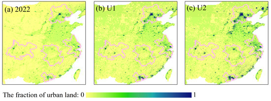 Fractions of urban land in study areas. (a) in 2022; (b) under the U1 scenario; (c) under the U2 scenario.