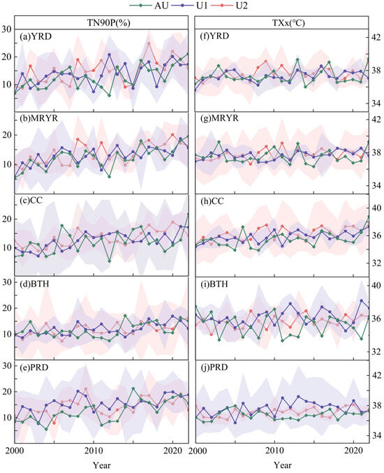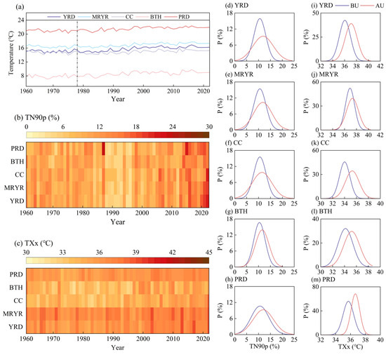 Figure 3i–m show the probability density function of TXx in each urban agglomeration during the BU period and the AU period. During the BU period, the average intensities of TXx in the YRD, MRYR, CC, BTH, and PRD were 36.15 °C, 36.94 °C, 34.36 °C, 34.31 °C, and 35.74 °C, respectively. During the AU period, these were 36.99 °C, 37.29 °C, 35.32 °C, 34.31 °C, and 36.89 °C, respectively. The average intensities of TXx in the YRD, MRYR, CC, BTH, and PRD during the AU period increased by 2.31%, 0.97%, 2.82%, 3.63%, and 3.21%, respectively, compared to the BU period. The PDFs of TN90p in the YRD, MRYR, CC and BTH showed a shift toward hotter conditions and a more flattened distribution shape, while that in the PRD showed a shift toward a steeper distribution shape.