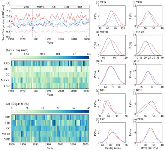 Historical variations in precipitation extremes in study areas. (a) annual precipitation amount; (b) Rx1day; (c) R95pTOT. The PDF of Rx1day in study areas. (d) the YRD; (e) the MRYR; (f) the CC; (g) the BTH; (h) the PRD. The PDF of R95pTOT in study areas. (i) the YRD; (j) the MRYR; (k) the CC; (l) the BTH; (m) the PRD.