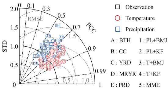 Although the performance of the WRF model in simulating the climate of China has been validated, its performance in simulating the climate of these urban agglomerations remains unclear. Therefore, it is necessary to validate the credibility of the WRF model before using it for extreme climate projections under urban land expansion. To facilitate a comparison of the results, this study normalized the STD. Figure 5 shows the Taylor diagrams of annual mean temperature and precipitation for the WRF model outputs and their multi-model ensemble (MME) from 2000 to 2022, compared to observations.
