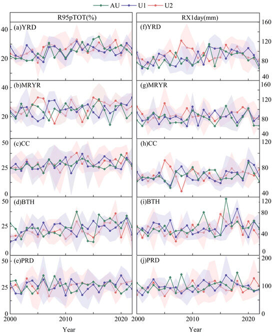 Under the U1 scenario, the average intensities of Rx1day in the YRD, MRYR, CC, BTH, and PRD were 88.03 mm, 84.91 mm, 69.59 mm, 48.89 mm, and 94.26 mm, respectively. Compared to the AU period, the average intensities of Rx1day in the YRD, MRYR, and CC increased by 5.11%, 4.51%, and 0.91%, respectively, while those in the BTH and PRD decreased by 7.14% and 5.59%. Under the U2 scenario, the average intensities of Rx1day in the YRD, MRYR, CC, BTH, and PRD were 92.67 mm, 89.62 mm, 70.41 mm, 51.14 mm, and 97.89 mm, respectively. Compared to the AU period, the average intensities of Rx1day in the YRD, MRYR, CC, and PRD increased by 10.65%, 10.31%, 2.10%, and 0.002%, respectively, while those in the BTH and PRD decreased by 2.87% and 1.95%.