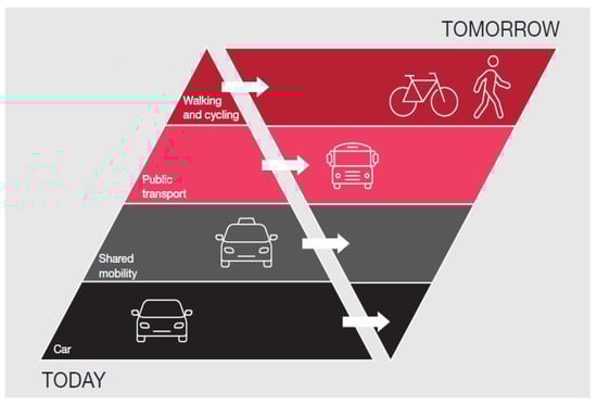 Taking into account the currently set goals of sustainable transport policy (introduction of fees for owning passenger cars, increase in the prices of fossil fuels, introduction of electric cars, reduction in the number of passenger cars, etc.), the share of public transport should be increased and the current transport pyramid (based on individual car transport) should be changed to a pyramid based on journeys by vehicles without combustion engines (bicycles, electric scooters, scooters) and pedestrian journeys, as illustrated in Figure 1. Rail transport should be considered a priority option for public transport in light of sustainable development. Combining rail transport (urban railway, tram, metro) with individual transport (city bikes, scooters, electric scooters) seems to be the most rational solution.