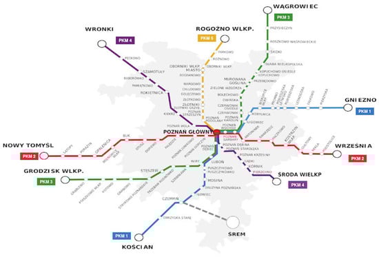 The Poznań Metropolitan Railway (PKM) is currently served by five lines utilizing the existing infrastructure managed by PKP PLK S.A. The network follows a classic star-shaped layout, with the city of Poznań at its center (see Figure 2). The connections radiate outward as follows: