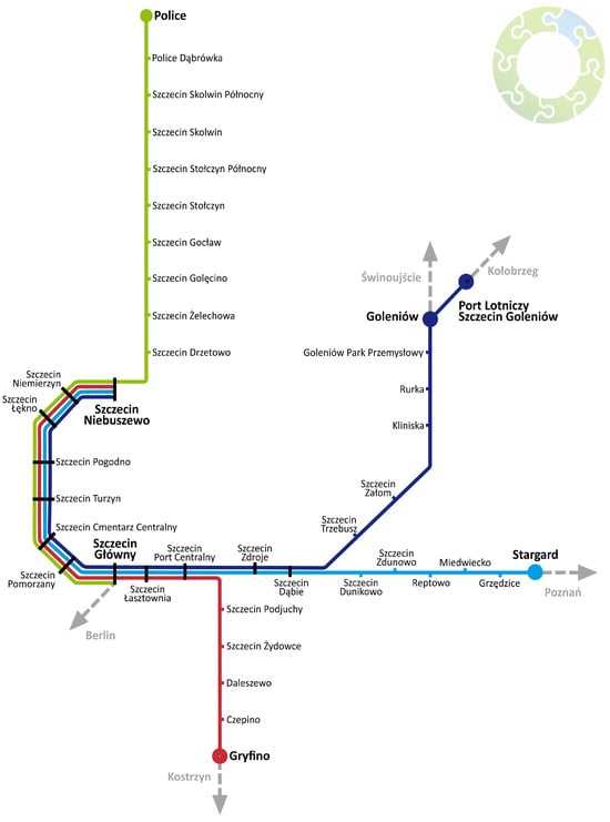 Schematic map of the lines serving SKM in Szczecin and the surrounding area [].