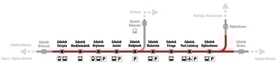 - Schematy Połączeń Kolejowych. Pomorska Kolej Metropolitalna. Available online: https://www.pkm-sa.pl/dla-pasazera/schematy/ (accessed on 15 December 2024).