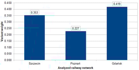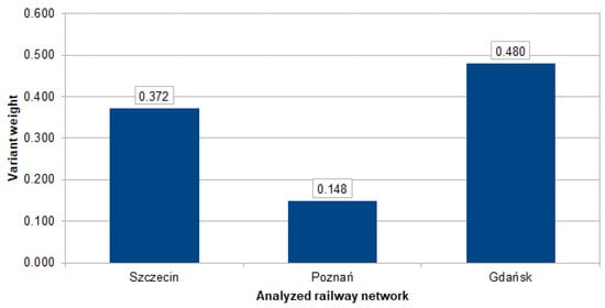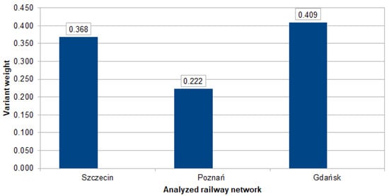 Regardless of the approach used, an improvement in the evaluation of the Poznań Metropolitan Railway network is noticeable, at the expense of a decline in the Pomeranian Metropolitan Railway’s score. However, this does not change the final assessment—Gdańsk’s PKM maintains the highest position in the rankings.