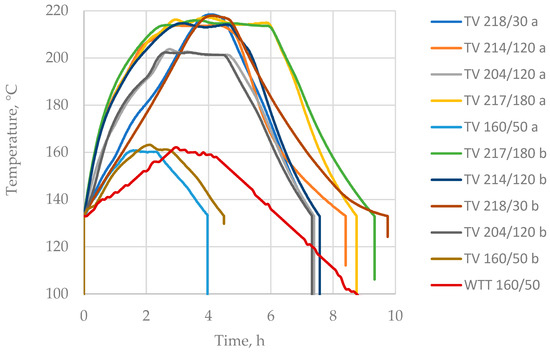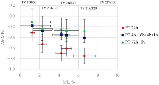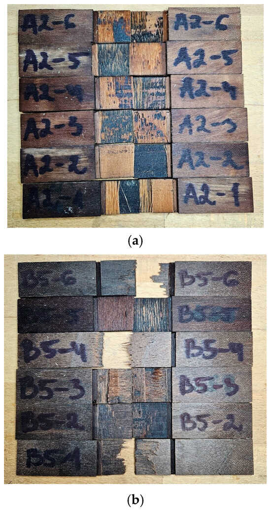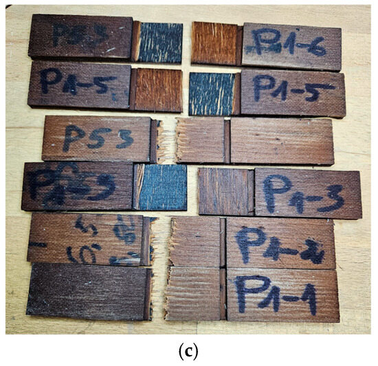 - After PT for 72 h + 1 h, unmodified birch plywood reveals the highest tensile–shear strength values (0.90 ± 0.05 MPa), followed by TV 160/50 (0.87 ± 0.16 MPa), TV 204/120 (0.76 ± 0.07 MPa), TV 218/30 (0.66 ± 0.09 MPa), TV 214/120 (0.65 ± 0.14 MPa), and TV 217.180 (0.54 ± 0.04 MPa).