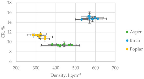 - Birch plywood exhibited the highest CR, at 15.3%, in TV 204/120 and TV 214/120 conditions. In comparison, aspen plywood had a CR of 37.3% lower at TV 214/120, while poplar plywood had a CR of 30% lower at TV 204/120. CR is not dependent on density only, as was believed before.