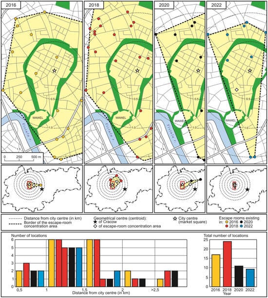 In the spatial aspect, the trend of escape rooms leaving Old Town districts, increasing their distance from the city centre, and scattering to other districts continued. Interestingly, peripheral escape rooms that had previously functioned in the suburbs also disappeared (Figure 1, Figure 2, Figure 3 and Figure 4).