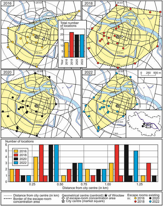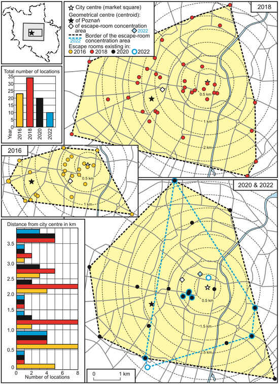 Interestingly, in the first two years, a vast majority of escape rooms in Polish cities were located in the city centre [6]. Research has revealed that as many as 80% of the facilities were situated within a 2.5 km distance from the central point (the Old Town Market) (see Figure 1, Figure 2, Figure 3 and Figure 4). There were only three exceptions to this rule: the largest metropolis—Warsaw (with escape rooms located within 5 km from the centre), Łódź (no market square, concentration along the main street, i.e., Piotrkowska), and Gdańsk (where the main cluster of escape rooms was shifted to the north, towards the centre of the whole Tri-City agglomeration). Such escape room location was determined by the demand (constant presence of residents and tourists, good transport accessibility) and the supply (heritage of the Communist era: unused apartments in historical townhouses, which could easily be adapted to create premises with an atmosphere).