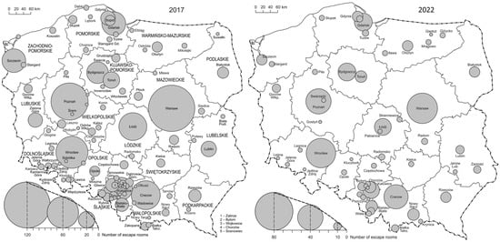 The spatial concentration of escape rooms still persists. Nearly 2/3 of these facilities are situated in five voivodeships (Silesian—14.52%, Lesser Poland—12.90%, Masovian—12.50%, Lower Silesian—11.90%, and the Greater Poland voivodeship—10.48%). Among the 10 largest cities, only in 3 were a significant number of new rooms opened (10 in Krakow, 7 in Poznań, and 4 in Wrocław). In the other cities, the growth was symbolic, or remained at the reduced state of 2022 (Table 1). As a rule, the number of escape rooms remains lower by 50–60% compared with the peak of their popularity (2017/2018). The reconstruction of the escape room sector is developing very slowly. The cities that are the closest to the levels from before the crisis are Wrocław (−15.4%), Kraków (−28.4%), and Gdańsk (−30.8%). On the other hand, the current escape room offering in Szczecin is five times lower than that during the boom.