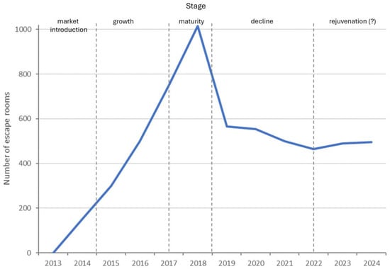 The course of this phenomenon presented in this study corresponds to the product life cycle. The theory developed by T. Levitt has been known in marketing since the mid-1960s. It has been frequently modified and adapted for tourist research: tourist areas [46,47] or new, specific touristic products [48,49]. Therefore, it may also be applied to an analysis of the development of escape rooms.
