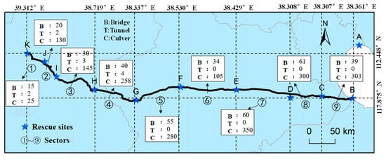 Topographical features have a significant impact on the risk of heavy-haul railway accidents, and this study incorporates this factor into the emergency rescue material scheduling model to enhance rescue efficiency. Steep slopes and complex geological conditions in high-elevation areas increase the risk of train derailments and rollovers, while soft soil layers and water accumulation issues in low-elevation areas can lead to unstable roadbeds, increasing the risk of train derailments []. Therefore, emergency rescue material scheduling plans must respond rapidly, providing necessary rescue materials and equipment.