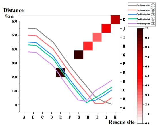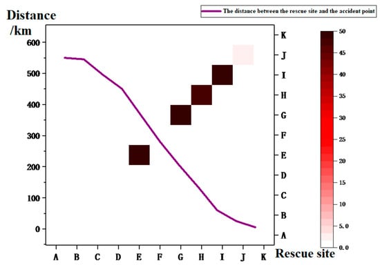 Figure 2 shows the number and distance of rescue sites involved. It can be seen that the number of rescue sites J and K that are closer to the accident point is much smaller than that of sites E and G that are farther away. Point F did not participate in the rescue, while point E, which is farther away, participated in the rescue 50 times, which indicates that the distribution of relief materials along the stations is unreasonable. In addition, the distance of site K from the accident point is shorter than that of site E, but its scheduling times are significantly lower than that of site E. The distance from the accident point of site J is also shorter than that of site G, but the rescue times of site J are also significantly lower than those of site G. Therefore, combined with the comprehensive analysis of the distance from stations along the route to the accident point and the number of dispatch times, it was initially found that the distribution of materials was unbalanced. This meant that the rescue stations that were closer to the accident point did not effectively participate in the rescue, which increased the rescue time. According to the scope and quantity of materials involved in the rescue of each station, the material reserves of individual stations is improved based on the utility theory. Under the constraint of ensuring constant total resources of the stations along the line, the materials at stations K and E are exchanged, and the materials at stations G and J are exchanged. The improved data are brought into the above model for recalculation, and the results are shown in Table 6.