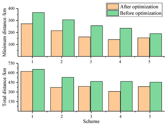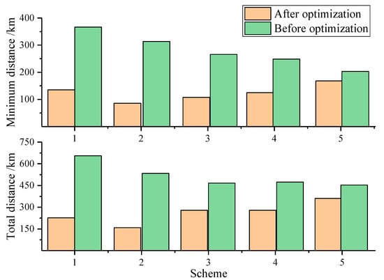 According to Table 7 and Figure 5, after a comprehensive comparative analysis of the distance of multiple accident points and the schemes, the maximum record of the shortest record after the scheme improvement can be reduced by 62.99%, and the maximum total distance can be reduced by 70.57%. For accident point ⑤, the total distance has increased compared to before, but it is within acceptable limits. Therefore, the optimization scheme can effectively improve the rescue efficiency. Through the optimization and adjustment of materials at multiple accident points, the distribution of materials can be rationalized effectively and the rescue efficiency can be improved.