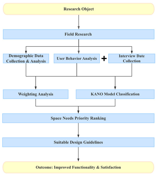 The evaluation results derived from the KANO model analysis serve as the foundation for developing design guidelines aimed at enhancing the service quality of public facilities at the terminal. These guidelines ensure that the design interventions not only address the unique needs of different user groups, but also enhance the overall functionality and user satisfaction of the site. The research framework is illustrated in Figure 3, providing a visual representation of the analysis process and the relationship between the various evaluation criteria.