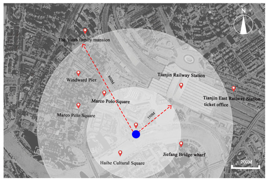 The research site is in the affluent area of the Haihe River scenic belt (Figure 4), adjacent to key landmarks such as Tianjin Station, the Century Clock, and the Liberation Bridge. This location boasts a prime geographic position with a well-developed road network and convenient transportation. The main access points are near the Liberation Bridge and the Century Clock, both of which are highly favored by locals and tourists alike.
