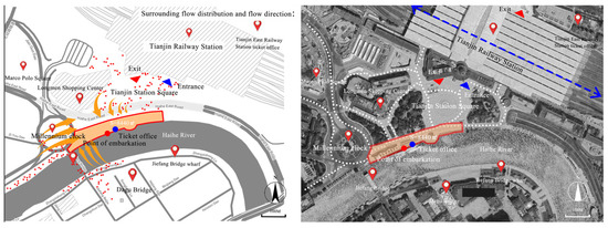 This study employs a mixed-method approach, combining qualitative observation with quantitative data analysis to assess the current state of the site. The focus of the observation includes pedestrian traffic, the availability of public spaces, and the overall accessibility of the area. Specifically, the study targets passengers at the train station and individuals gathered around the plaza near Tianjin Railway Station. Notably, the iconic “Century Clock”, located at the center of the roundabout, attracts a large number of tourists for photos, but it also leads to congestion in the areas surrounding the roundabout. Since the site is free of motor vehicle traffic, attention can be concentrated on pedestrian flow without interference from vehicular movement. People primarily enter the site from two directions, as follows: 1. Citizens and tourists gathering near Jiefang Bridge and the Century Clock. 2. Passengers emerging from the train station and individuals in the plaza in front of the station (Figure 5). The site covers an area of 8440 m2, with a greening rate of approximately 8.3%, mainly concentrated around the Century Clock and along the riverbank. The building density of the site is approximately 0.24%, with high pedestrian traffic.