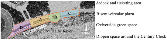 Observation areas: The site was divided into four observation zones to capture pedestrian activity in different areas: Zone A—dock and ticketing area, Zone B—semi-circular plaza, Zone C—riverside green space, Zone D—open space around the Century Clock (Figure 6).