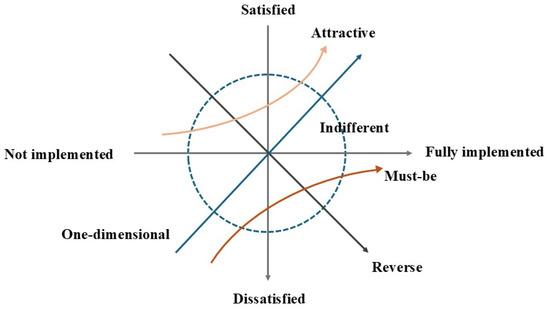 The KANO model identifies three main factors influencing customer satisfaction [30]: (1) Must-be attributes. These are basic requirements that, if unmet, lead to dissatisfaction, but their fulfillment does not increase satisfaction. (2) One-dimensional attributes. These needs directly affect customer satisfaction. Meeting them increases satisfaction, while failing to meet them decreases satisfaction. (3) Attractive attributes. These are needs that customers have not explicitly expressed. Their absence does not cause dissatisfaction, but their fulfillment enhances satisfaction and encourages positive word-of-mouth [30]. Additionally, customer perceptions of product and/or service quality can be analyzed from two other dimensions: indifferent quality and reverse quality. Those with indifferent quality have no significant impact on user satisfaction. The presence or absence of such elements does not elicit any specific response from users, as they do not concern themselves with this type of element. Reverse quality refers to service elements that are unnecessary, and user satisfaction decreases when such elements are not provided [31] (Figure 7).