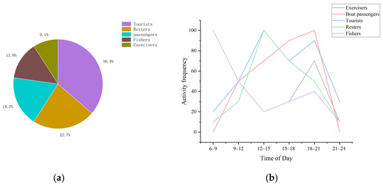 Figure 8 provides a detailed analysis of the activity frequency of different groups over a 24 h period, including exercisers, boat passengers, tourists, resters, and fishers. The results show that the usage patterns of each group vary, reflecting their behavioral characteristics and time preferences. The specific findings are as follows: