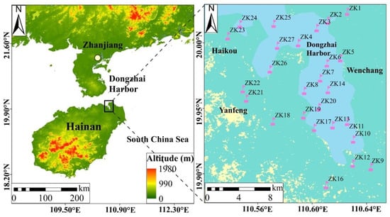 The Dongzhai Harbour (19°51′ N–20°01′ N, 110°32′ E–110°37′ E), located between Wenchang and Haikou in the northeastern part of Hainan Island, is the first national nature reserve established in China with mangrove forests as the main object of protection (Figure 1). It has a gentle terrain, with a length of about 84 km and an area of about 54 km2 []. The area is located in a tropical maritime climate zone, with an average temperature of about 23.5 °C, an average precipitation of about 1676.4 mm, an average sunshine duration of about 2200 h, and a seawater salinity ranging from 0% to 20% annually []. The special land structure makes the tidal wave of the study area irregular and semi-diurnal, with a mean tidal range of about 0.89 m. From the 1960s to the present, the mangrove area in the Dongzhai Harbour has shrunk by nearly 50% under the multiple impacts of shrimp aquaculture, tourism, and urbanization construction []. In addition, the rapid development of industry and agriculture around the study area from the 1990s has resulted in wastewater being discharged directly into the wetland through rivers []. Therefore, the current environmental pressure on the mangrove wetlands in the Dongzhai Harbour should not be underestimated. To ensure the even spatial distribution of sampling points and to maintain the representativeness of the data and the objectivity of the results, the sampling points were laid out as shown in Figure 1. There were 26 samples in total. The top 20 cm of soil and marine sediments were collected for analysis. The sampling points for marine sediments were reached through a boat. Samples were collected with minimal disturbance, sealed in Polyethylene (PE) bags, and transported to the laboratory at low temperatures.