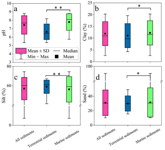 pH and grain size compositions of sediments in the Dongzhai Harbour mangrove wetland. * and ** denote p value < 0.05 and 0.01, respectively. (a) Distribution of sediment pH values. (b) Distribution of clay content in sediments. (c) Distribution of silt content in sediments. (d) Distribution of sand content in sediments.